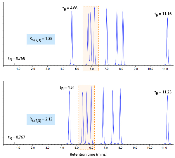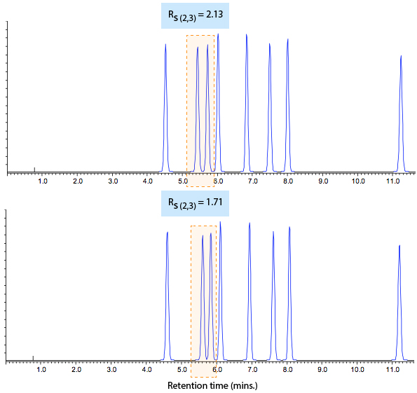 As you can see, the separation doesn’t look as it should in the reference chromatogram (bottom) and we needed to investigate why this is the case. The peaks within the highlighted area in Figure 1 have changed so that resolution is lost (selectivity altered?), but the rest of the separation looks pretty much the same. For subtle changes such as this we may use a checklist approach to investigate the cause.