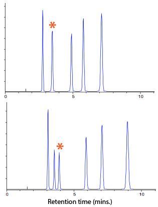 Figure 1: Separation of proprietary compounds which are a mixture of acidic and neutral. The current chromatogram (top) shows altered resolution / selectivity from the reference chromatogram (bottom).