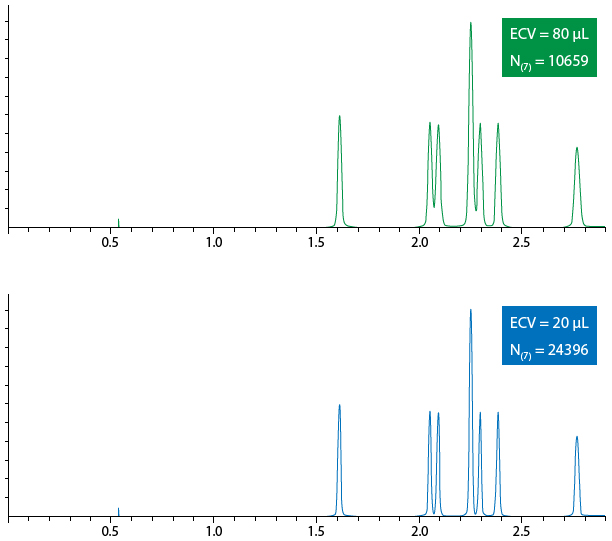 To conclude, Figure 3 shows the effect of extra column volume on a chromatographic separation using a column of 100 x 2.1mm with an ECV of 20 μL (bottom) and 80 μL (top).