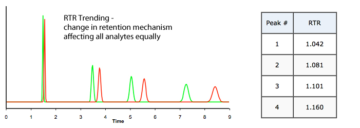 c) No Trend (Random changes in RTR value) – selectivity change indicating pH / solvent or stationary phase issues (changes)