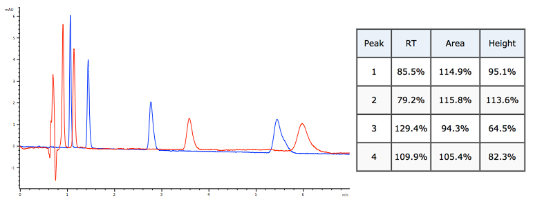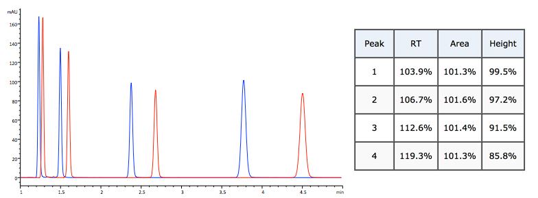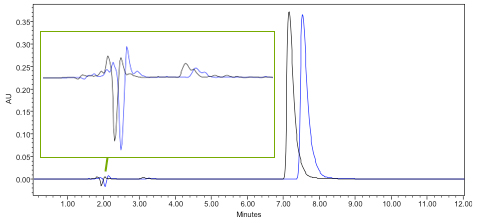 Example 2 – analyte retention time changes but void baseline disturbances overlay well – issue is probably with %B, Temperature or selectivity change.