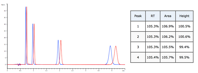 Flow rate reduced by 5%. Retention and peak area change – height remains constant.