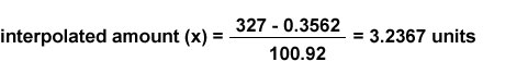 If an average sample peak area of 327 units is obtained, the absolute amount of sample is calculated as follows (solve for x = interpolated amount):