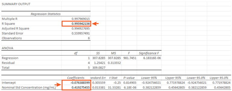 The magnitude of the error associated with this measurement may be surprisingly high to some readers given the ‘goodness of fit’ of the regression line, but for those of who wish to understand this further – examine the y residuals calculated in the regression statistics (C25 to C30 on the results sheet) and the residuals plot, to see that the calibration data shows significant spread about the regression line and it is this spread, and not the linearity of the regression line, which is used to estimate the error within any value interpolated from the calibration line.