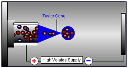 - Once the droplet leaves the sprayer, as it has accumulated a vast excess of either cationic or anionic analyte ions (depending upon whether the instrument is operated in positive or negative ion mode), it travels under the influence of the applied potential difference between the sprayer and sampling orifice.
