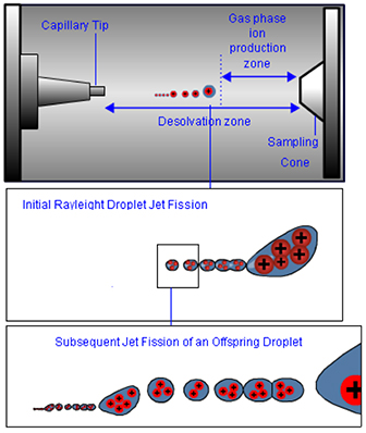 Figure 5: Subsequent droplet jet fissions occur until the droplet volume and number of charges create suitable conditions for analyte ions to be liberated into the gas phase. The position within the interface at which this occurs is vital to ensure maximum sensitivity.