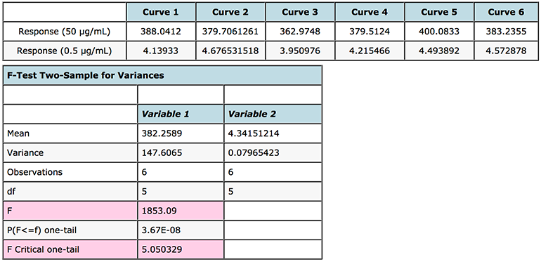 An F-test can be easily carried out in MS Excel (F-Test Two-Sample for Variances) and works on the basis that if the F statistic value in the output is greater than the One-tail Critical F factor (take from tables or from the Excel output) then we need to reject the null hypothesis and state that the variances at the high and low end of the curve are unequal and that some form of weighting will produce more valid answers. The results of this test, performed on the instrument response rather than the interpolated values, are shown in Figure 3. As the F-test compares the variances of two samples (or populations if one has large amounts of data), it is typical to compare the data from the highest and lowest concentrations on the calibration curve. One needs at least two determinations at each concentration, although to increase the validity of the test – one should aim to have at least six replicates.
