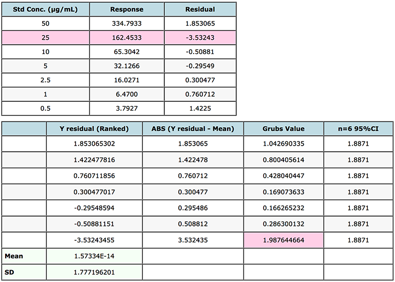 In this case we note that because the Grubbs Factor value for the standard with residual -3.5324 (25 μg/mL point) is greater than the critical factor (1.887) then this point may be rejected from the calibration line and the quality of the interpolated data re-evaluated using the new regression equation.