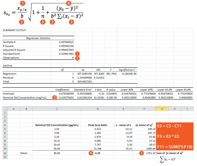 However, as the clinical therapeutic limit for this test is 10 mg/mL I wanted to give an estimate of the error associated with this result. This is easy to estimate using Equation 3 and I’ve indicated how derive the terms of the equation from the regression output and a simple Excel calculation in the treatment below;